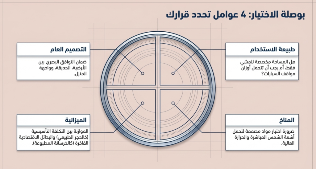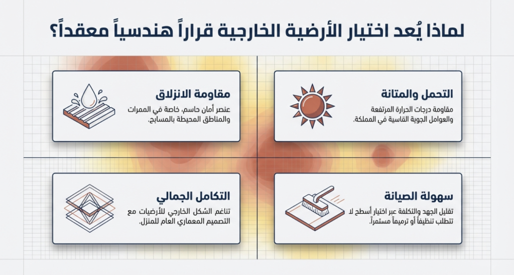 اختيار الأرضيات الخارجية لا يعتمد فقط على الشكل الجمالي، بل يجب مراعاة عدة عوامل مهمة مثل: