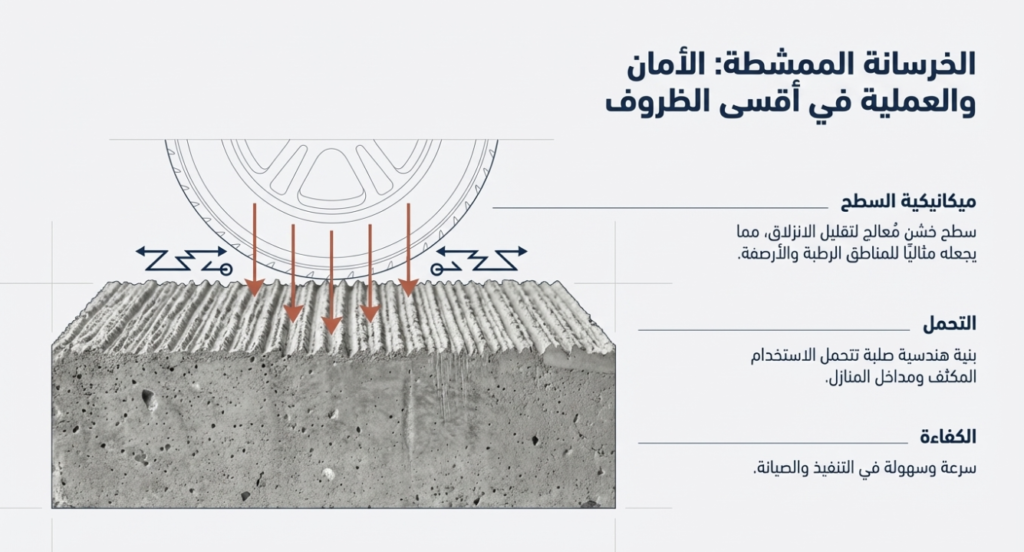 تعد الخرسانة الممشطة من الخيارات العملية جدًا خاصة في الأماكن التي تحتاج إلى مقاومة عالية للانزلاق.