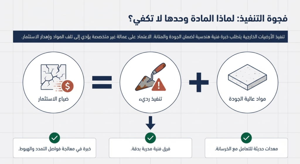 تنفيذ الأرضيات الخارجية يحتاج إلى خبرة فنية لضمان الجودة والمتانة. الشركات المتخصصة تمتلك المعدات الحديثة والفرق الفنية المدربة لتنفيذ المشاريع بدقة.