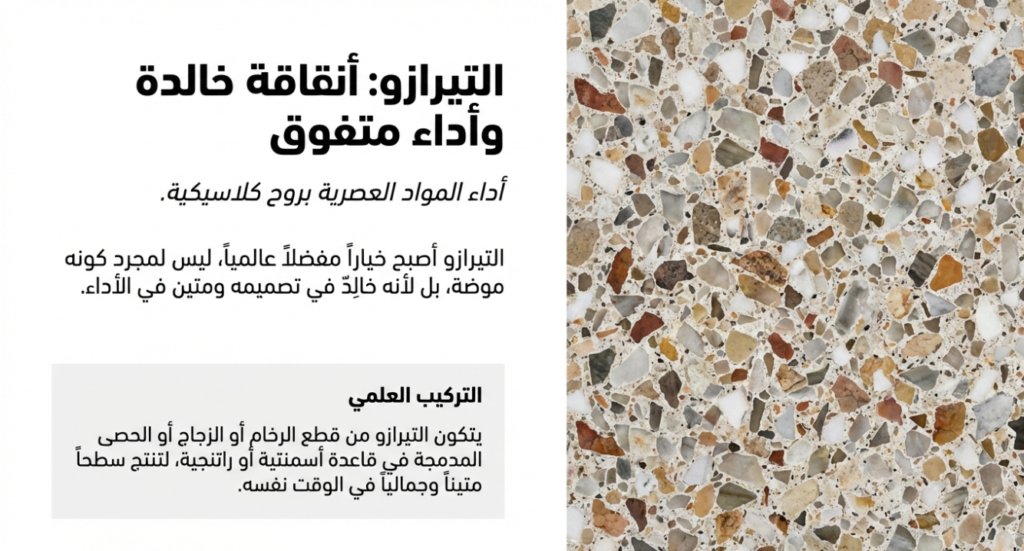 التيرازو أصبح خيارًا عالميًا مفضلًا ليس لمجرد كونه موضة، بل لأنه خالِد في تصميمه ومتين في الأداء. يتكون التيرازو من قطع الرخام أو الزجاج أو الحصى المدمجة في قاعدة أسمنتية أو راتنجية، لتنتج سطحًا متينًا وجماليًا في الوقت نفسه.