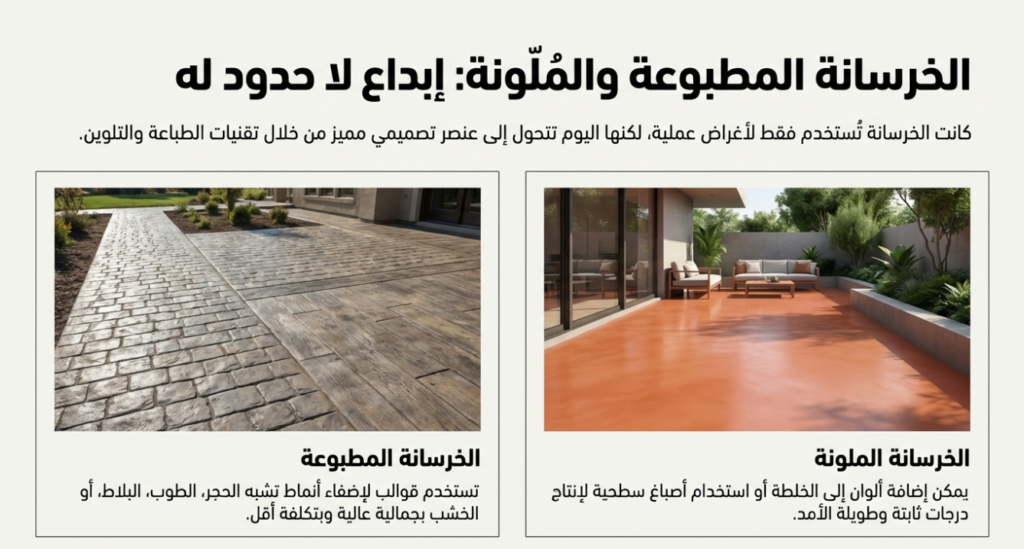 - الخرسانة المطبوعة: تستخدم قوالب لإضفاء أنماط تشبه الحجر، الطوب، البلاط، أو الخشب، بجمالية عالية وبتكلفة أقل.