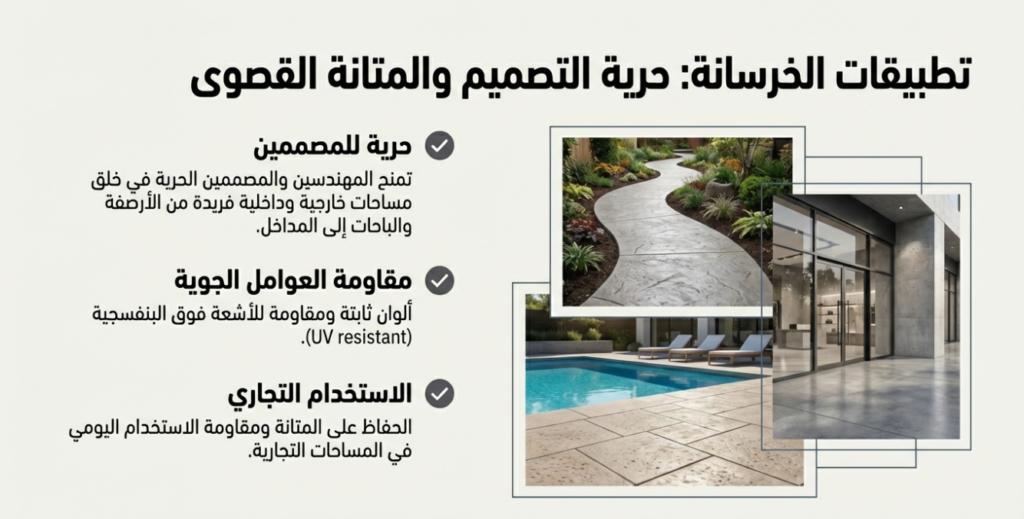 هذه التقنية تمنح المهندسين والمصممين الحرية في خلق مساحات خارجية وداخلية فريدة، من الأرصفة والباحات إلى المداخل والمساحات التجارية، مع الحفاظ على المتانة ومقاومة الاستخدام اليومي.