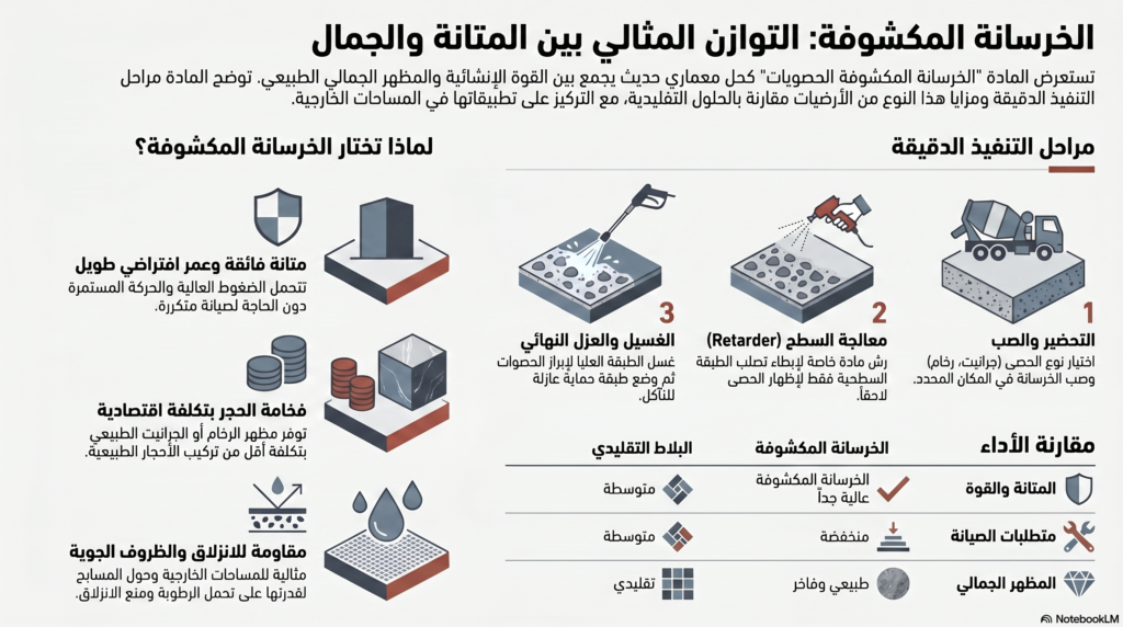 هذا النوع من الخرسانة أصبح خيارًا مفضلًا في المشاريع السكنية والتجارية والحدائق العامة نظرًا لتحمله الشديد وعمره الطويل ومظهره المميز الذي يشبه الأحجار الطبيعية.