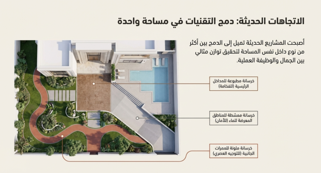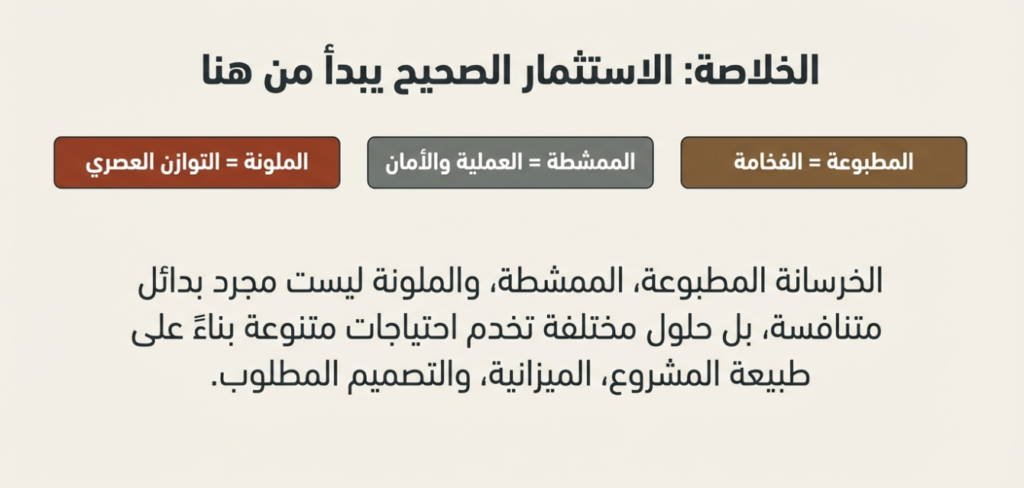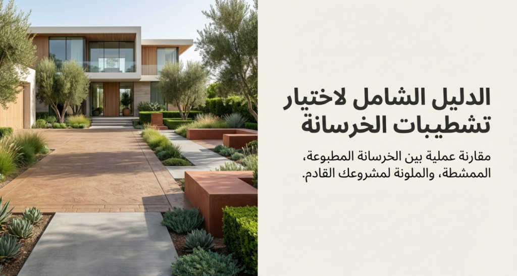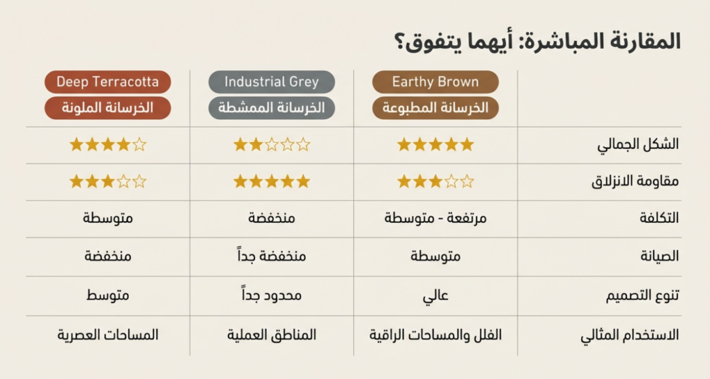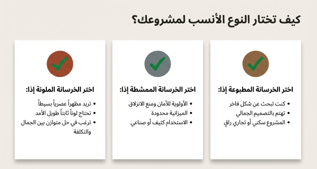 إذا كان هدفك الفخامة فالمطبوعة هي الخيار الأفضل، وإذا كنت تبحث عن العملية والأمان فالممشطة تتفوق، أما إذا أردت مظهرًا عصريًا متوازنًا فالخرسانة الملونة تقدم الحل المثالي.