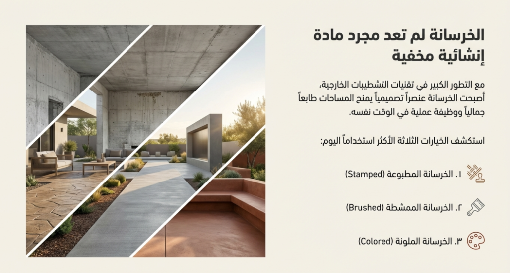 الفرق بين الخرسانة المطبوعة والممشطة والملونةمع التطور الكبير في تقنيات التشطيبات الخارجية، لم تعد الخرسانة مجرد مادة إنشائية تقليدية، بل أصبحت عنصرًا تصميميًا يمنح المساحات طابعًا جماليًا ووظيفة عملية في الوقت نفسه. ومن بين أكثر الأنواع استخدامًا اليوم: الخرسانة المطبوعة، الخرسانة الممشطة، والخرسانة الملونة.
