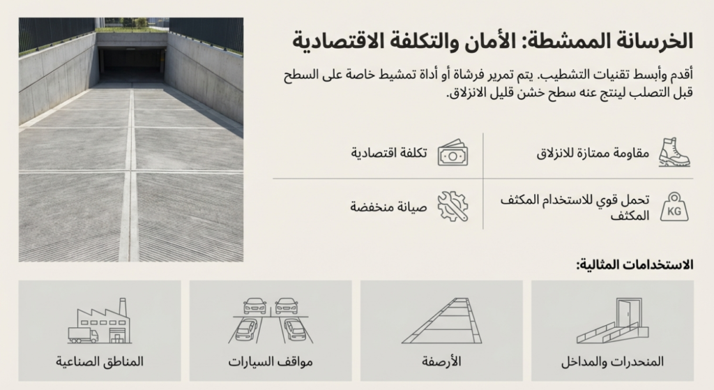 الخرسانة الممشطة يتم تنفيذها عبر تمرير فرشاة أو أداة تمشيط خاصة على سطح الخرسانة قبل تصلبها، مما ينتج عنه سطح خشن قليل الانزلاق.