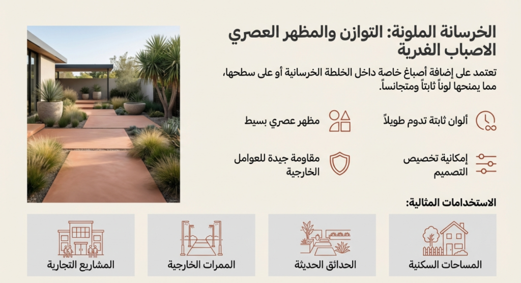 الخرسانة الملونة تعتمد على إضافة أصباغ خاصة داخل خلطة الخرسانة نفسها أو على سطحها، مما يمنحها لونًا ثابتًا ومتجانسًا.