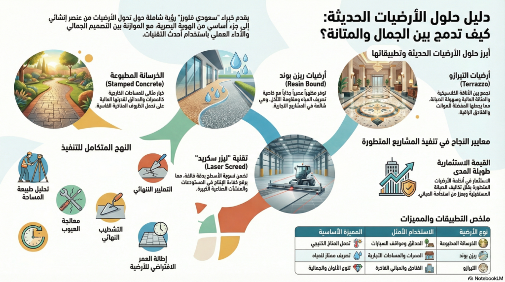 حلول الأرضيات الحديثة، لم تعد الأرضيات مجرد عنصر إنشائي داخل أي مساحة، بل أصبحت جزءًا أساسيًا من الهوية البصرية والتجربة اليومية للمكان. سواء كنت تخطط لإنشاء منزل عصري، تطوير مشروع تجاري، أو تنفيذ مساحة خارجية مميزة، فإن اختيار نظام الأرضيات المناسب يمثل خطوة حاسمة في نجاح المشروع.