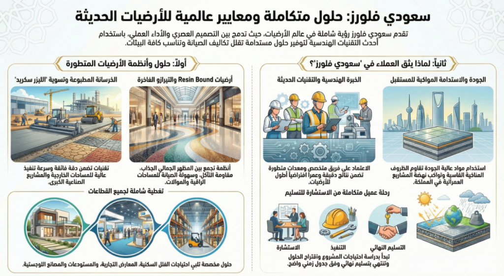 يمثل Saudi Floors نموذجًا متطورًا لشركات تنفيذ الأرضيات الحديثة، حيث يجمع بين الخبرة الهندسية والتقنيات المتقدمة لتقديم حلول متكاملة تناسب مختلف المشاريع.