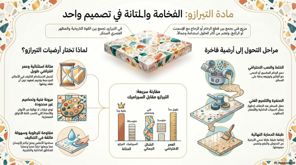 التيرازو لم يعد مجرد أرضية تقليدية كما كان في الماضي، بل أصبح عنصرًا فنيًا فاخرًا يستخدم في المنازل، المولات، الفنادق، والمباني الحديثة لما يوفره من مظهر أنيق وعمر افتراضي طويل جدًا.
