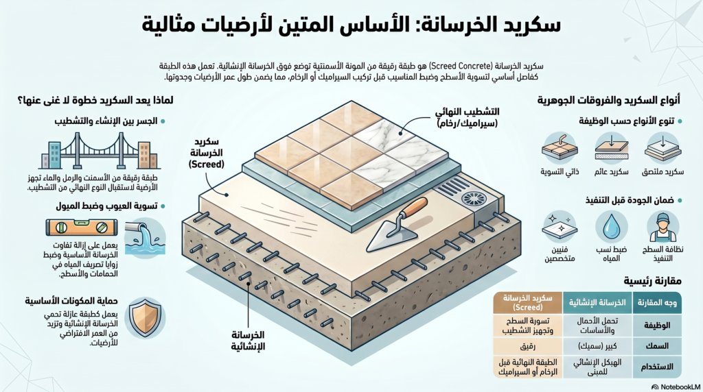 الـ Screed Concrete هو طبقة رقيقة من المونة الأسمنتية (أسمنت + رمل + ماء) يتم وضعها فوق البلاطة الخرسانية الأساسية بهدف: